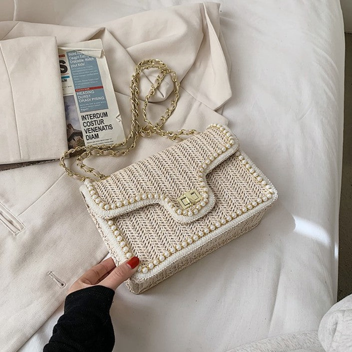 "Wear Oatmeal Beige shoulder-strap with ivory wide-leg jumpsuits – let the chain gleam against summer tans for ‘Mad Men’ modernism."
