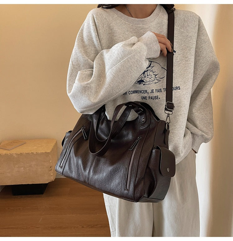 Surprisingly spacious and practical! The leather is softer than I expected, but honestly, it’s held up beautifully for daily use. My 13-inch iPad Pro slides in perfectly along with my makeup pouch, water bottle, and even a light top. I’ve carried it every day for work this month—the vintage design gets compliments, and it pairs so well with both casual and dressy outfits.