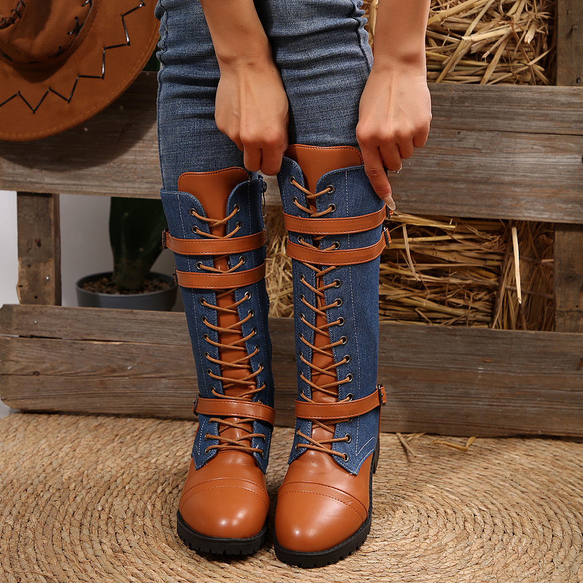 Bootara Women's Rogue Riding Boots - PU & Denim Lace-Up Combat Boots (US 5-10.5)